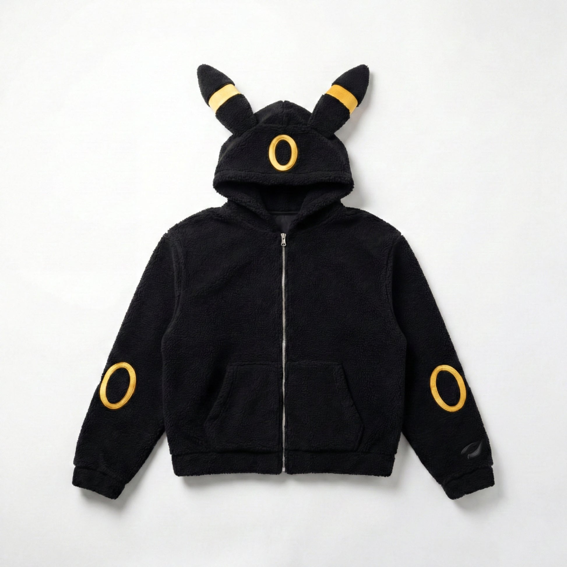 Cut in a black sherpa with contrast yellow detailing. Features stitch embroidery of the iconic Umbreon silhouette.